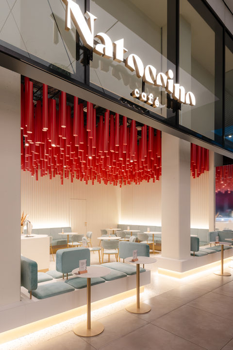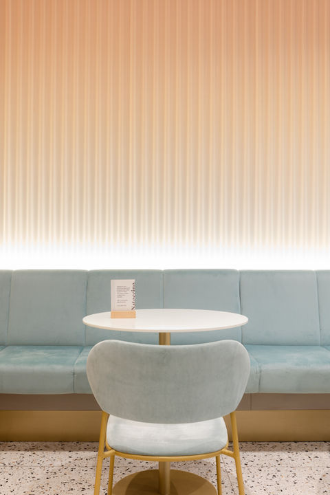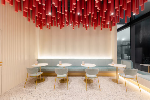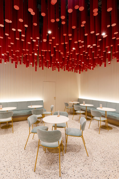 Z celého podhledu visí více než 1000 plechových trubek, které jsou nepravidelně rozmístěné v různých výškách a některé z nich zároveň slouží jako svítidla, čímž prostor získává dynamiku a hravost. Lavice a židličky jsou z jemného sametu v oblých tvarech, podsvícené zlaté sokly a subtilní zlaté konstrukce přinášejí do prostoru exkluzivitu a odlehčení. Podlaha je pokryta terrazzo dlaždicemi se zlatými a tmavými prvky, které evokují křupavý posyp na zmrzlině a dokonale ladí s celkovým dojmem.