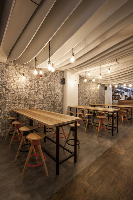 V areálu bývalých parních mlýnů v Holešovicích jsme připravili interiér restaurace "Pod Parou" nebo "Pod Párou". Prostor a místo je kouzelné samo o sobě. Pozůstatek industriální architektury s mohutnými betonovými sloupy jsme jen doplnili vltavskou vlnou. Ostatní je velmi jednoduché.
